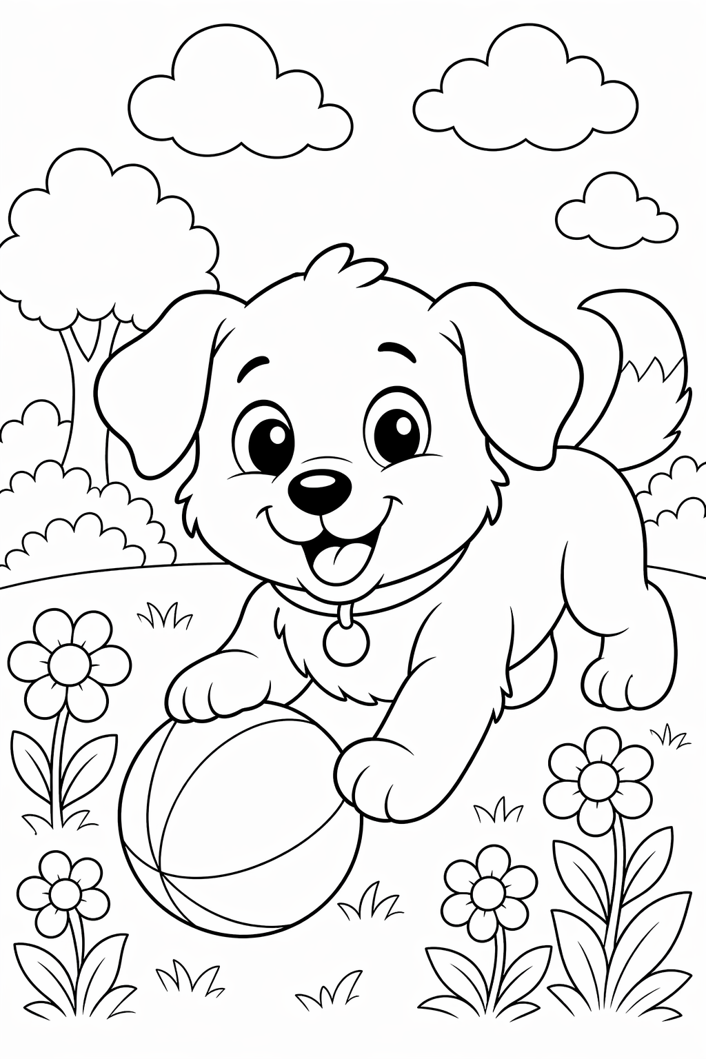 Iloinen pentu leikkii pallolla yksinkertaisessa puistoaiheisessa värityskuvassa.