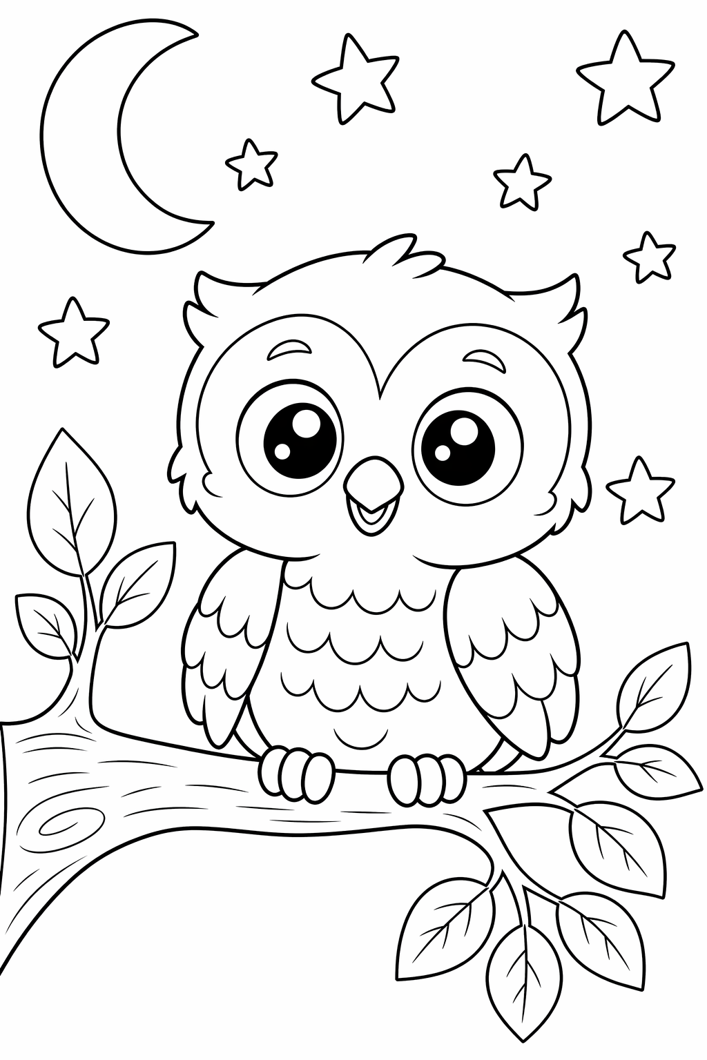 Suloinen pöllönpoikanen istuu oksalla tähtien kuun ja yksinkertaisten lehtien keskellä.