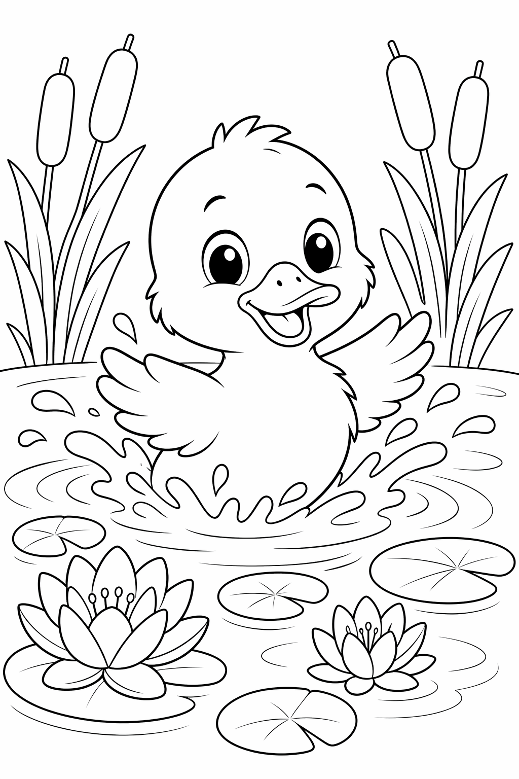 Iloinen ankanpoika polskii pienessä lammikossa lumpeiden ja osmankäämien keskellä.