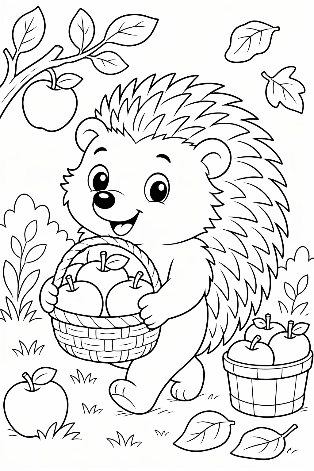 Suloinen siili kantaa omenoita sadonkorjuuaiheisessa värityskuvassa.