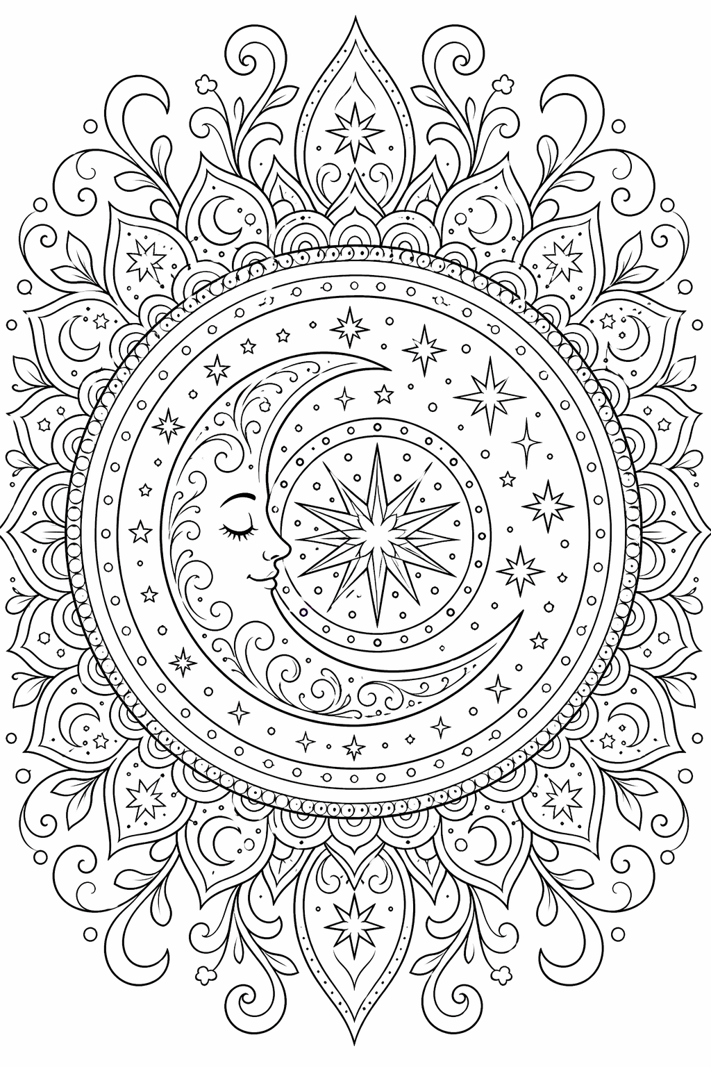 Lataa: Kuu- ja tähtimandala – värityskuva