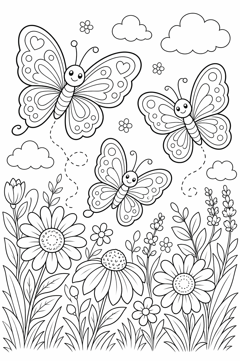 Perhosia täynnä oleva niitty jossa on kukkia ruohoa ja valoisa leikkisä sommitelma.
