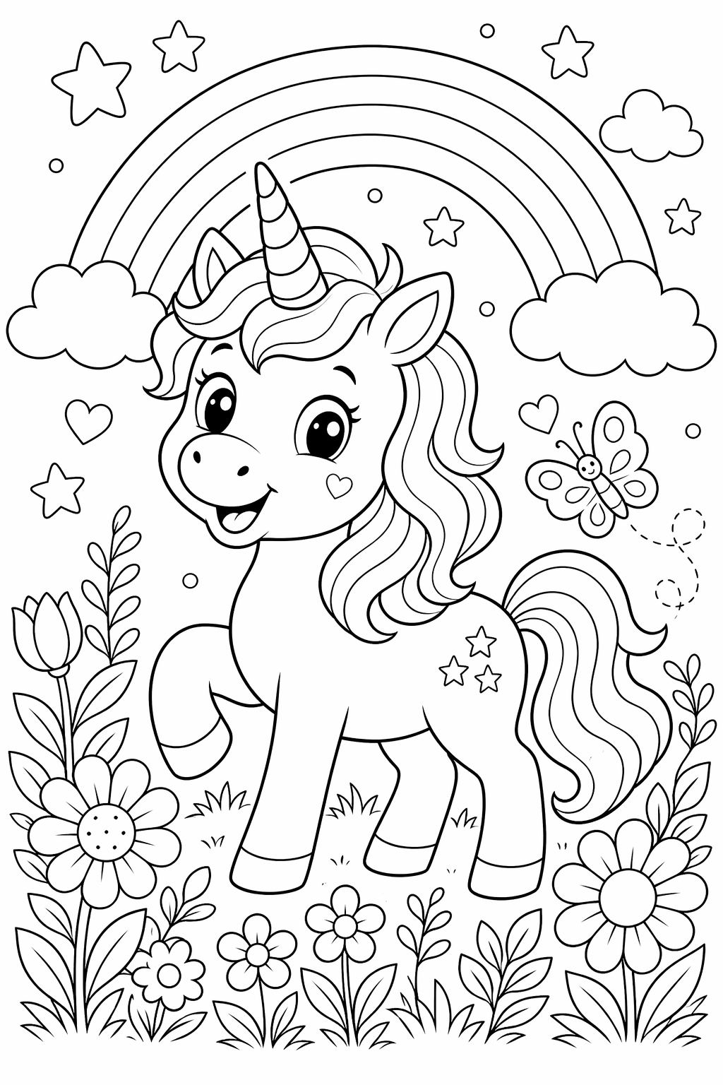 Lataa: Yksisarvinen sateenkaaripuutarhassa – värityskuva