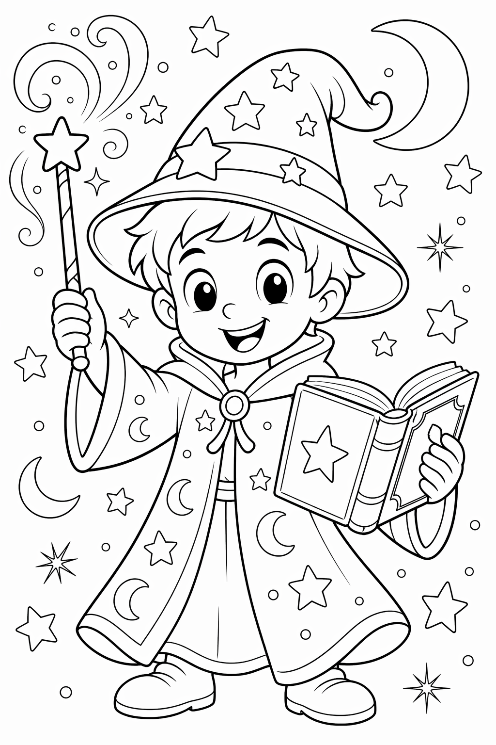 Suloinen nuori velho seisoo tähtien ja loitsukirjan kanssa leikkisässä taikamaailmassa.