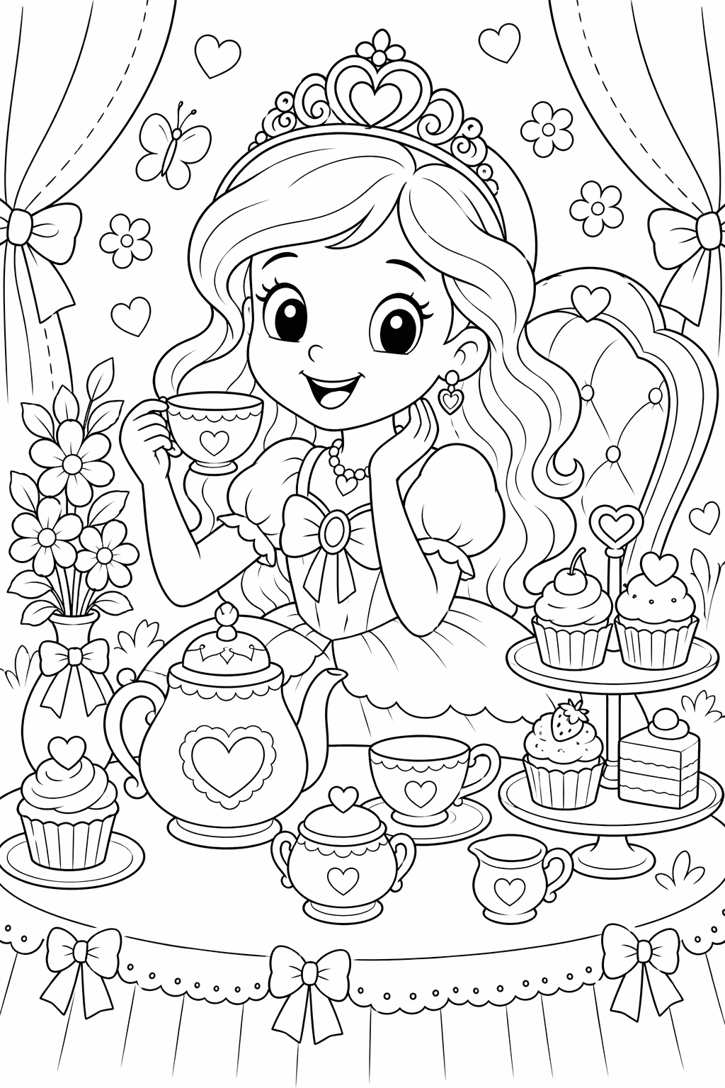 Prinsessan teekutsuaiheinen kohtaus jossa on teekuppeja herkkuja ja leikkisä kattaus.