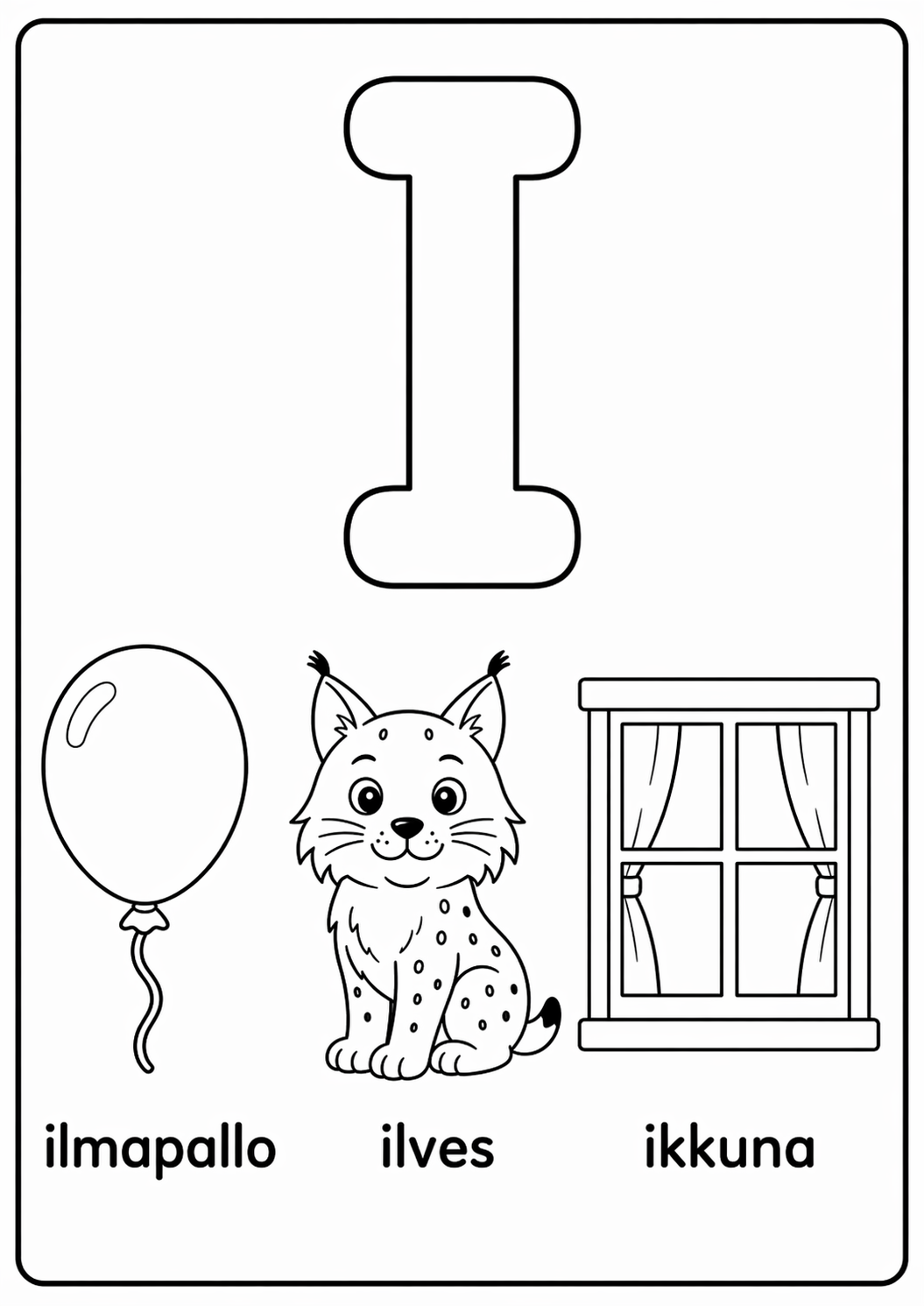 Iso I-kirjain sekä sanat ilmapallo, ilves, ikkuna tarjoavat selkeän harjoitussivun I-kirjaimen oppimiseen.