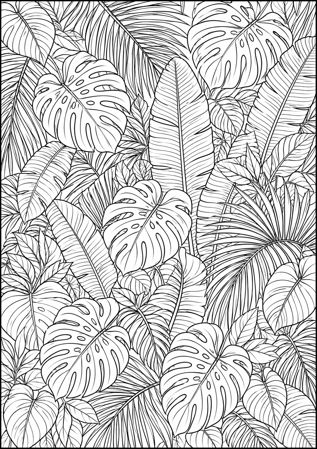 Lataa: Trooppinen lehtikatos – värityssivu aikuisille