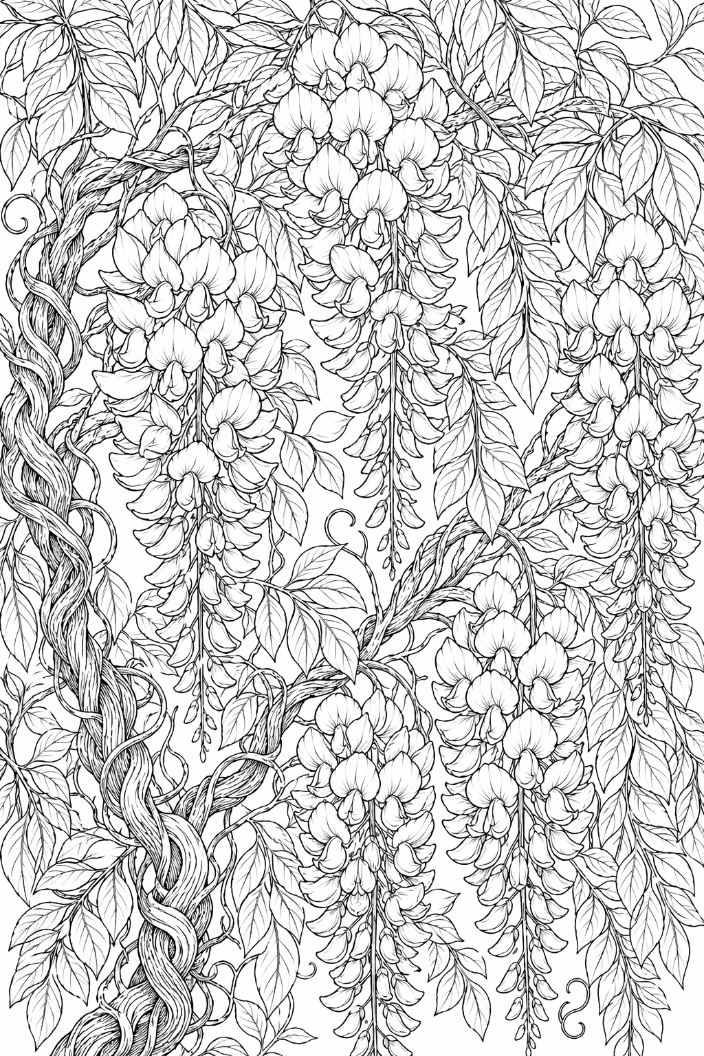 Roikkuvat sinisateen kukkatertut ja kiertyvät köynnökset elegantissa pystysommitelmassa.