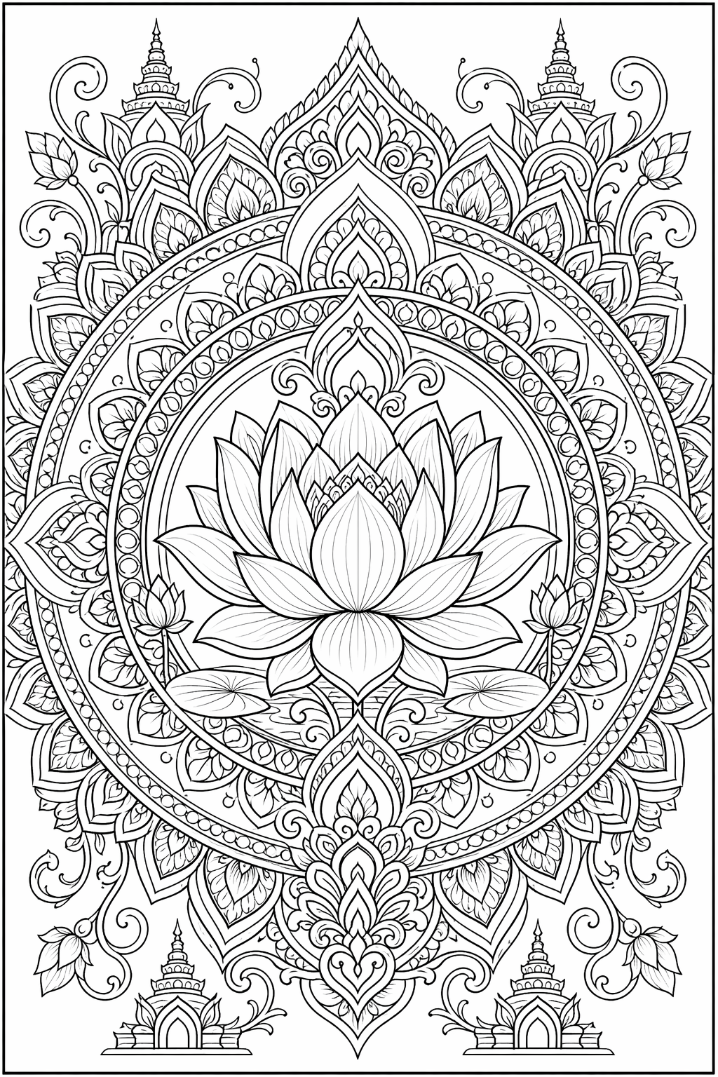 Lootuskeskeinen mandala, jossa temppelimäinen geometria ja koristeelliset reunukset kohtaavat.