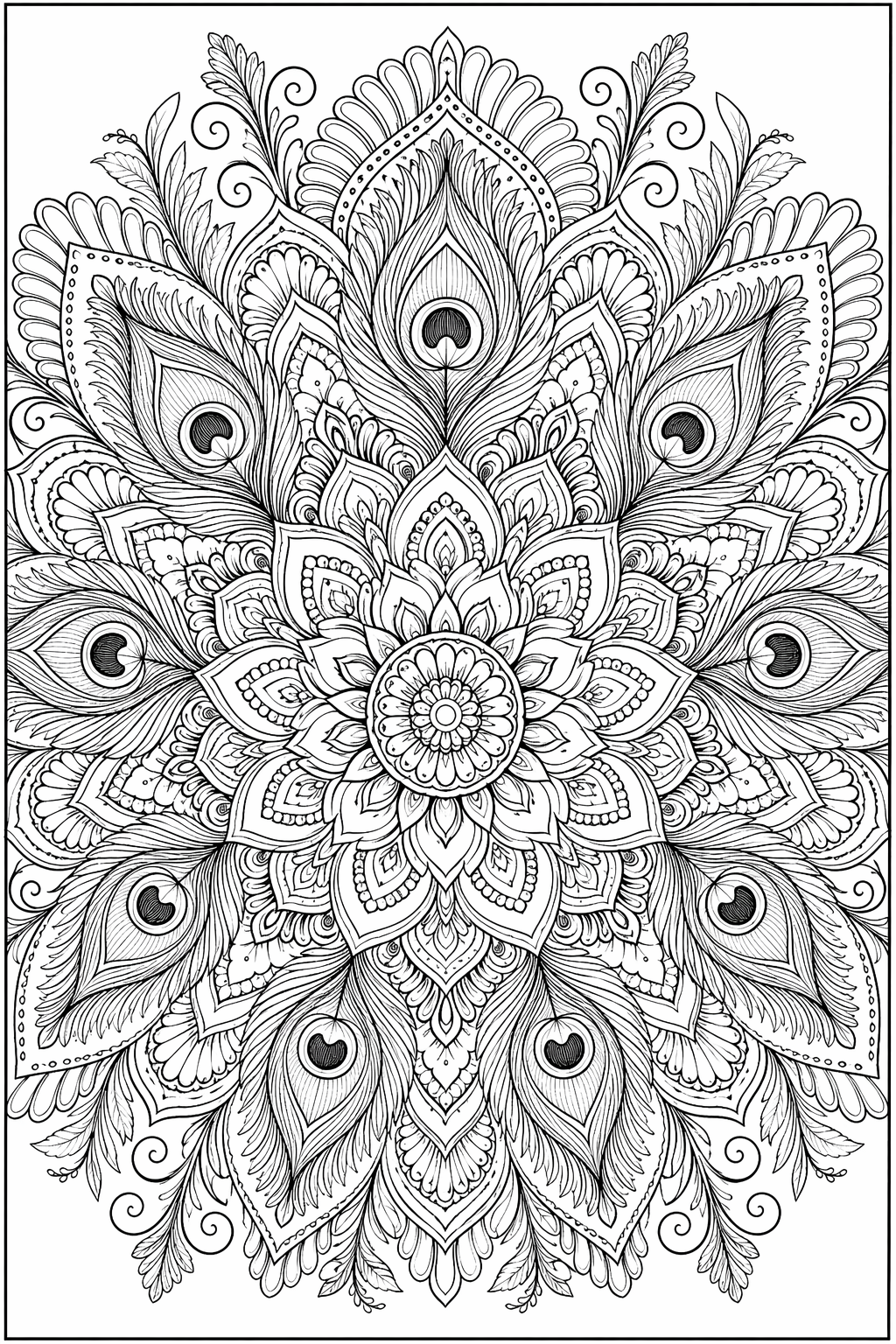Säteittäinen mandala, jossa höyhensilmät, viuhkamuodot ja ornamentaalinen symmetria korostuvat.