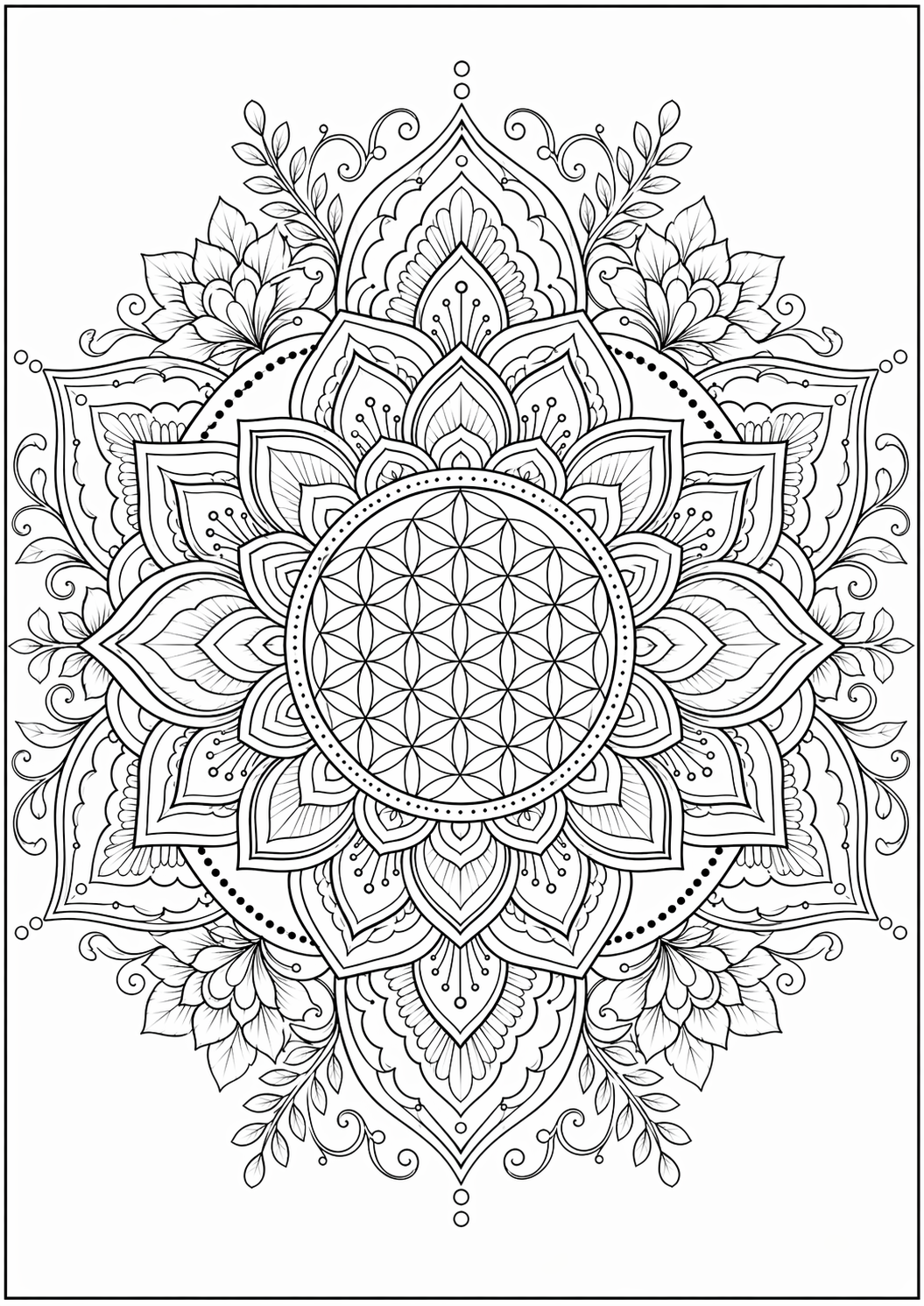 Geometrinen kukkamandala, jossa elämän kukkaa muistuttava rakenne saa uusia kukkaisia kerroksia.