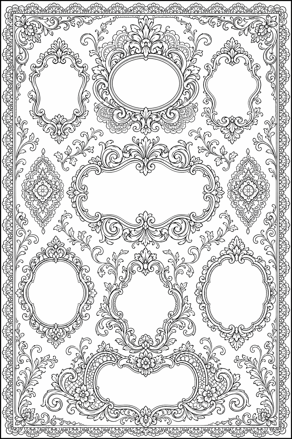 Koristeelliset pitsireunukset ja tyhjät kartussit ilman tekstiä tai kirjaimia.