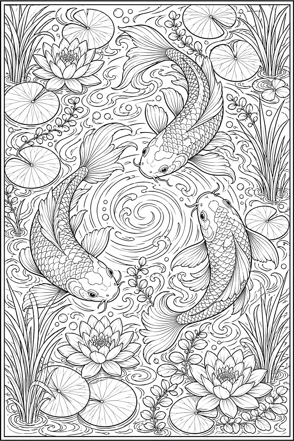 Lataa: Koi-lammen kiertoliike – värityssivu aikuisille