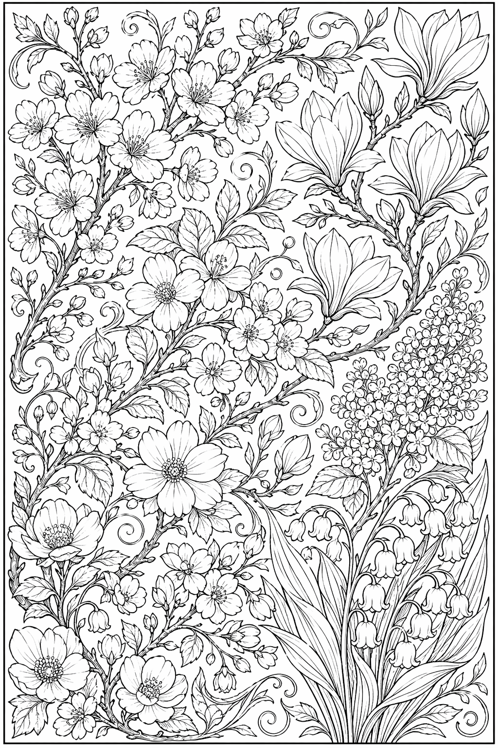 Keväinen sommitelma, jossa kukinnot, köynnökset ja ilmava rakenteellinen detalji täyttävät sivun.