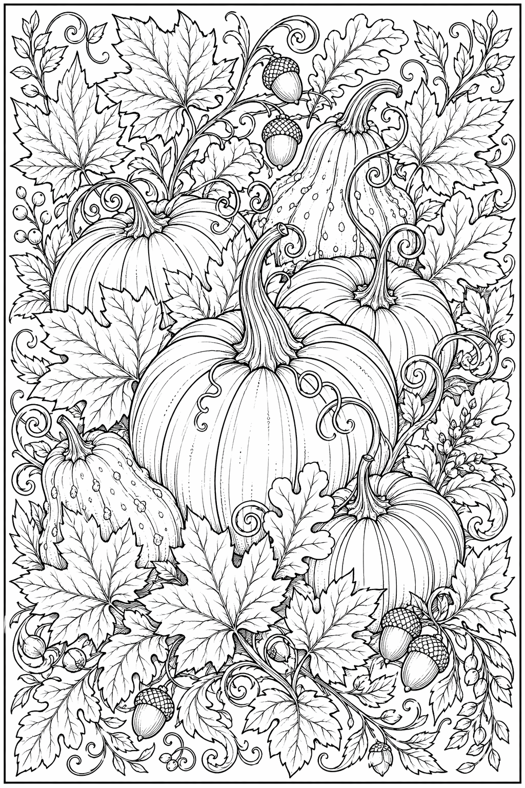 Lataa: Syksyinen kurpitsalehdistö – värityssivu aikuisille