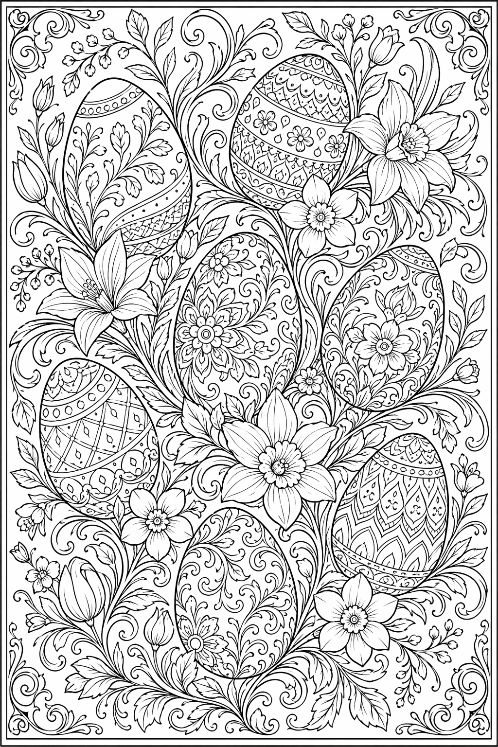 Lataa: Pääsiäismunaornamenttipuutarha – värityssivu aikuisille