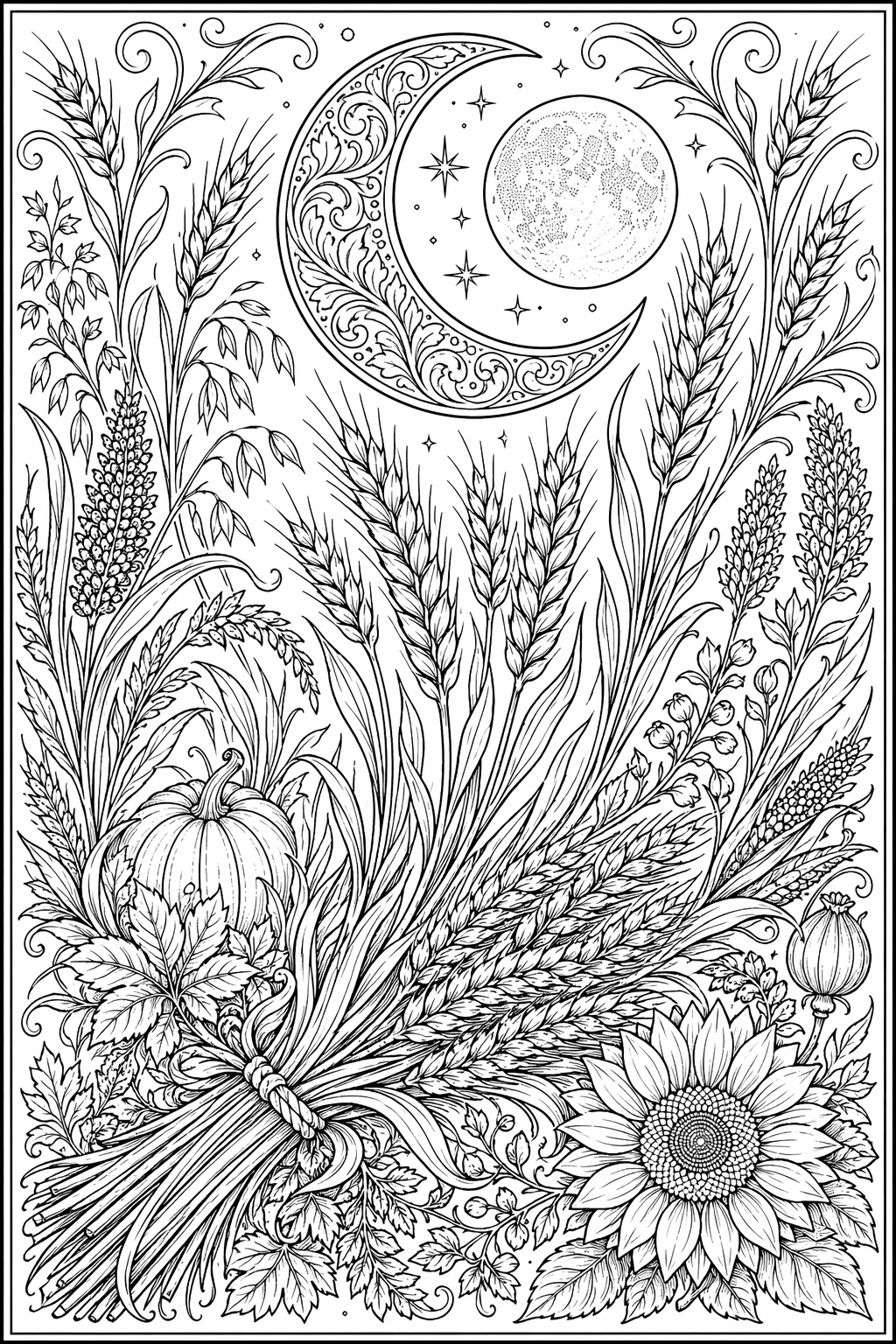Sadonkorjuupelto muuttuu koristeelliseksi koko sivun kuvioksi, jossa kuu ja viljat rytmittävät sommitelman.