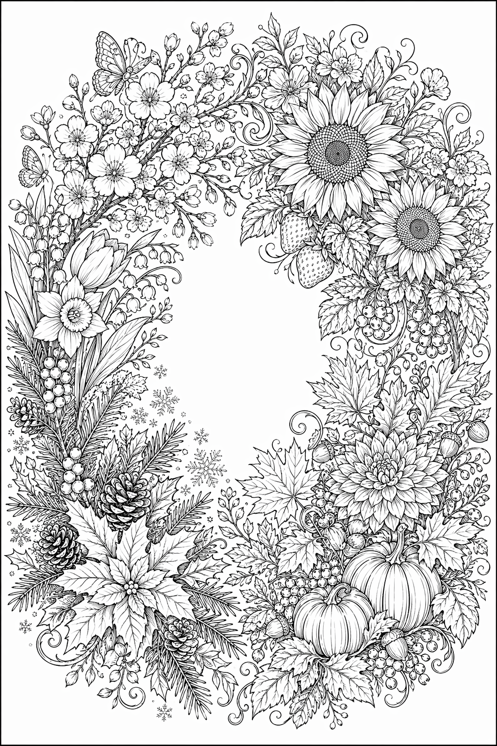 Lataa: Neljä vuodenaikaa seppeleessä – värityssivu aikuisille